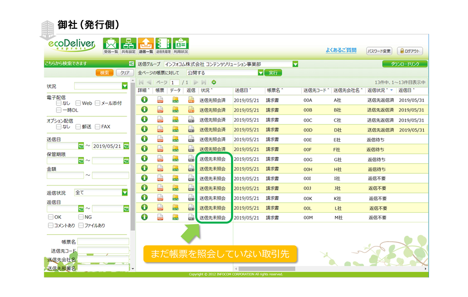 エコデリバーはパソコンとインターネット環境さえあれば操作ができますので、請求書や支払通知書などの帳票の送付業務、未照会の取引先へあらためて照会依頼のメールを通知するような確認依頼業務などをオフィスという場所に縛られることなく実施できます。